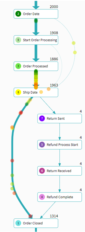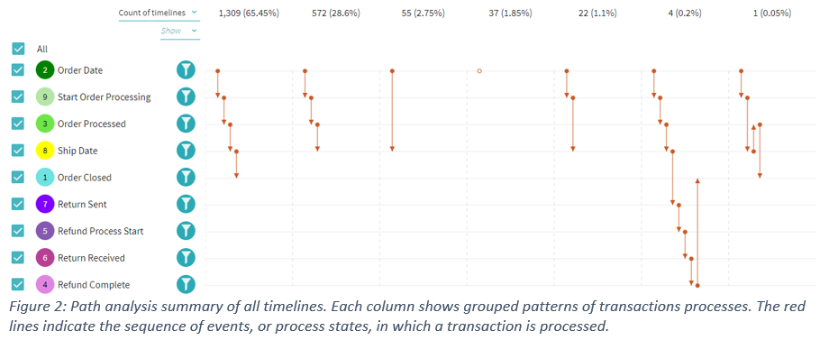 Using the path, interval, or distribution tools you can drill into various transactions and analyze your data at different levels of granularity. Figure 2, below, illustrates that in our retail use case 65% of all transactions follow the expected processing path of order is placed, order is processed internally, then the order is shipped out and marked as closed once delivered. The image also shows other processing sequences that are contained within the data.