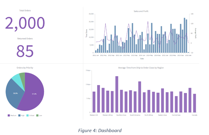 Metrics can be defined to aggregate the data then be used to create KPIs and visualizations in a dashboard. A user can make metrics from counts of items, time intervals, aggregations of attribute values, number of events, or cost. Predefined metrics can be utilized in simple dashboards to provide high-level business insights and to display information on the overall performance of a process. A simple dashboard for our use case, Figure 4, summarizes the number of orders, the number of returns, and the different priority of orders that were within the data set. Two graphs are displayed: one comparing the sales and profits over time, the other breaking down the number of transactions by region.