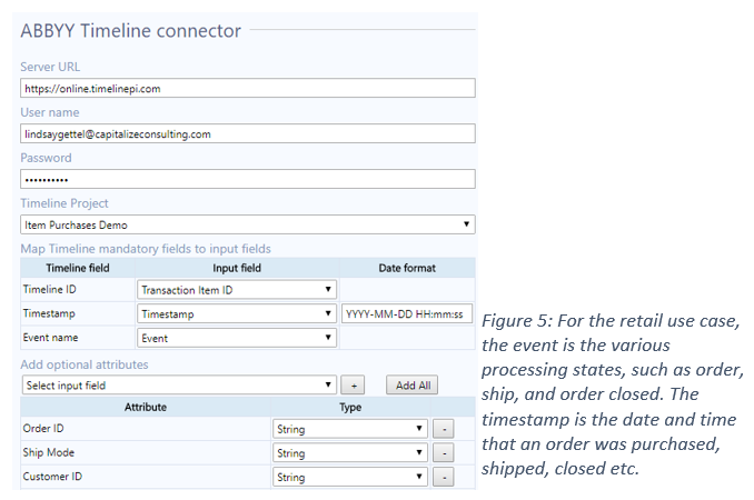 ABBYY Timeline is a process intelligence platform that analyzes trends, durations, and process flows of time series data. With Timeline a user can view the end-to-end processing of transactions and gain insights into process performance. Using the ABBYY Timeline connector tool in Alteryx, users can blend many data sources and send data into Timeline for analysis.