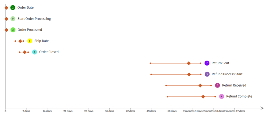 Now that we have looked at the overall processing path and performance, we want to look more closely at each process step individually. In the interval analysis tool, we can see a summary distribution plot that shows the average time in status and the 75% interval. Figure 3 reveals that the statuses with the longest time to complete deal with items that are returned. Transactions that are returned take longer to close because each process step of a return takes longer on average and there is generally a larger time range in which returns are handled.