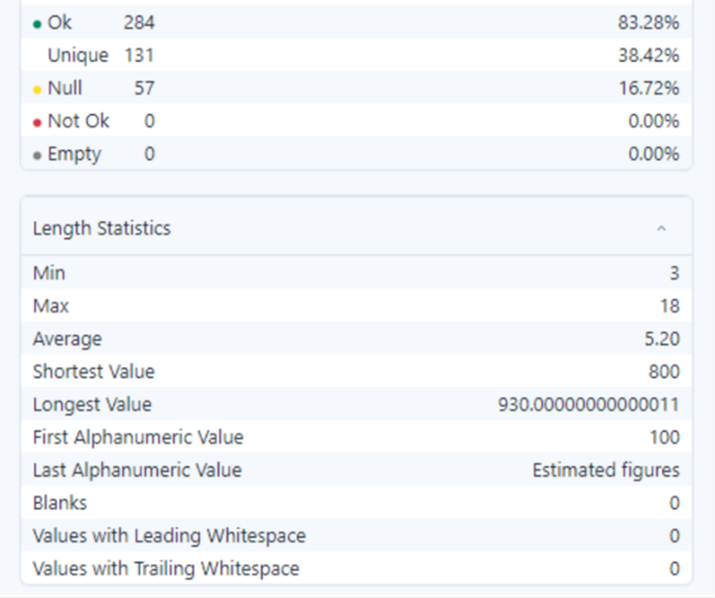 Unlike Dataiku, Alteryx identifies leading and trailing whitespace when analyzing data quality and can differentiate between null and empty values in the data health summaries.
