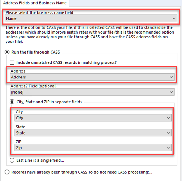 Next, click on the Business Match tool and look in the configuration window to make a few selections. First, you’ll need to select the field in your dataset that contains the names of the businesses. After that, you will need to choose whether you would like to run your records through CASS. CASS (Coding Accuracy Support System) is used to standardize your addresses to help improve match rates with the D&B Business Location file. Finally, you will need to select the fields that contain the business Address, City, State, and ZIP.