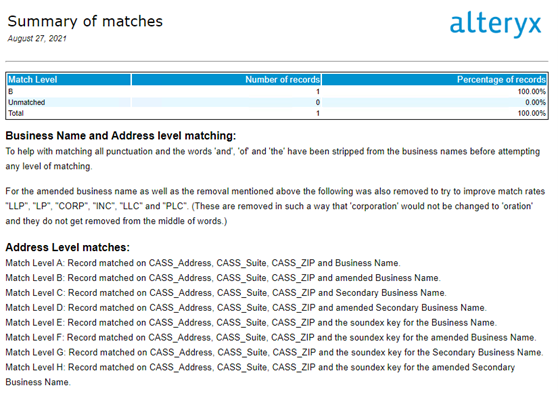 In output 2, you will find a match summary. This will tell you how many records were able to match to the D&B Business Location file, the match level of those records, and the total number of records that were unmatched.