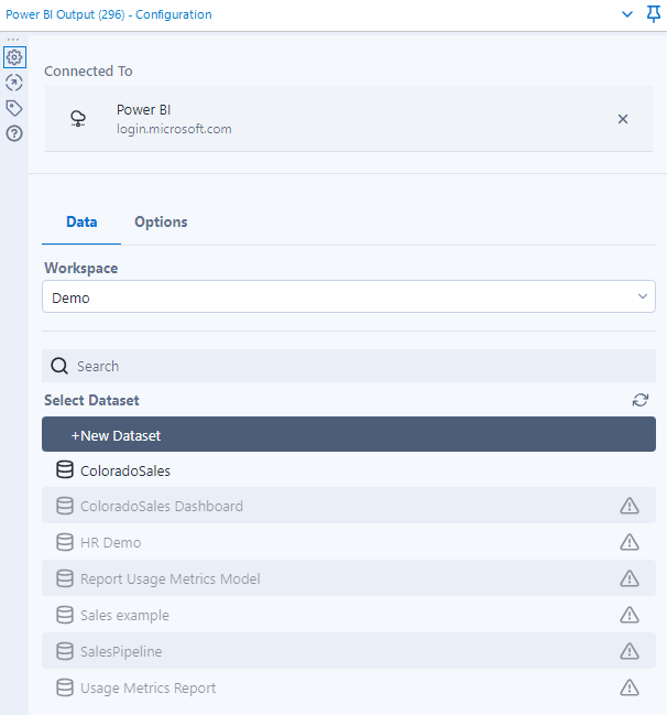Once you have selected your Workspace and Dataset, toggle to the Options tab in the Configuration pane for: