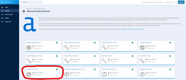 The Microsoft Power BI Output Tool does not come installed with a standard download of the Alteryx Designer platform. To install the Microsoft Power BI Output Tool, use this link to download the Power BI .yxi file from the Alteryx Analytics Gallery.