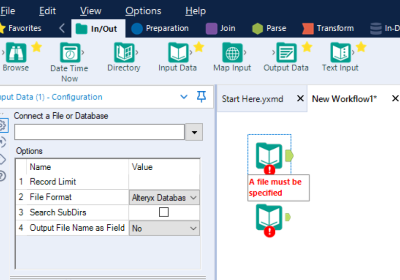 In order to connect to a data source in Alteryx, a user will drag the “Input Data” tool from the color-coded “In/Out” menu item. After dropping the tool on the interface, the connection is made to a data source by clicking on the drop down circled in the Configuration pane.