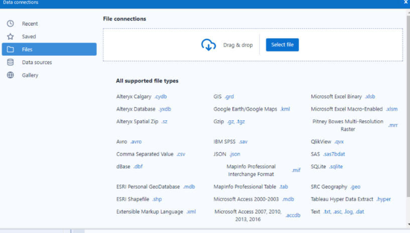 Once inside of the configuration settings, a user may navigate to a directory to choose a file or isolate by a specific data type within a directory by clicking on the data type. Alteryx connects to a wide variety of data sources out-of-the-box, including Alteryx-created files, and more obscure data sources may use standard connections like ODBC.