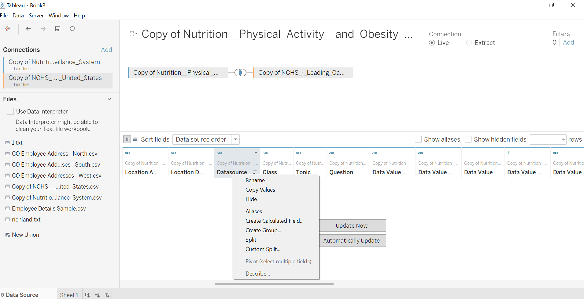 Like Alteryx, Tableau has a drag–and–drop interface for connecting data sources, though the connection interface is different from the “Worksheet” and “Dashboard” interfaces.