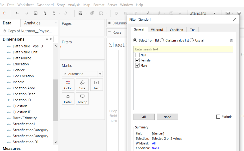 One may ask, “Why would I use the filter tool on the data source instead of applying the filter directly to a visualization?” Generally, this is related to performance, optimization, and audience. For example, in our data set, there are a small number of records that were null or blanks. As our data sets become more complex, the nulls may become problematic; thus, it would be best to have them eliminated in the data set.
