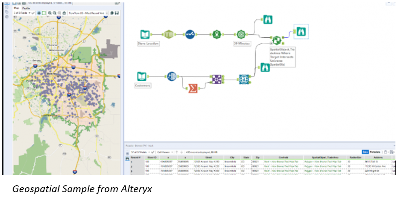 Alteryx connects to geospatial entities such as US Census and TomTom to give exact attributes based on certain location characteristics. This ability to create specific longitude/latitude points on a given location and create visualizations that show the contextual data on a map provides robust context to geospatial data. Users can view the data on the map inside of Alteryx Desktop or can view the raw data output.