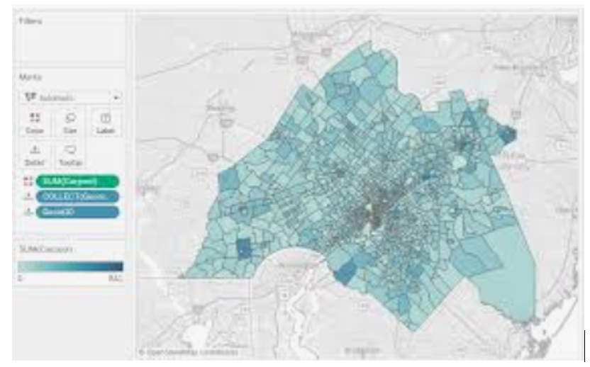 Tableau Desktop is consists of cards/shelves, the view or “viz,” data pane, analytics pane, toolbar, data source page, and sheet page. After connecting to the data source, the data in Tableau Desktop is divided into dimensions, which are non-aggregable supportive attributes, and measures, which are aggregated when used. Typically, visualizations are created in Sheets, then Sheet visualizations are added to the Dashboard or Stories. Dimensions or measures can be pulled on the view pane directly or dropped into rows/columns. Users may allow Tableau to choose the visualization type based on the data set or choose a different one under “Show Me.” Additional data context can be added to the visualizations by dropping data onto one of the cards or shelves, providing context such as color changes due tied to a data element, filtering, additional detail, and size of data measure on a visualization.