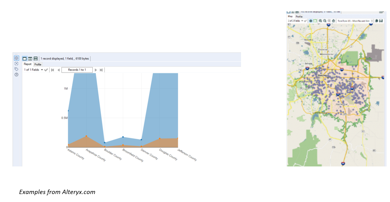 - Other reporting options exist in Alteryx that allow users to view commonly used visualizations, such as charts and maps in the Browse output.