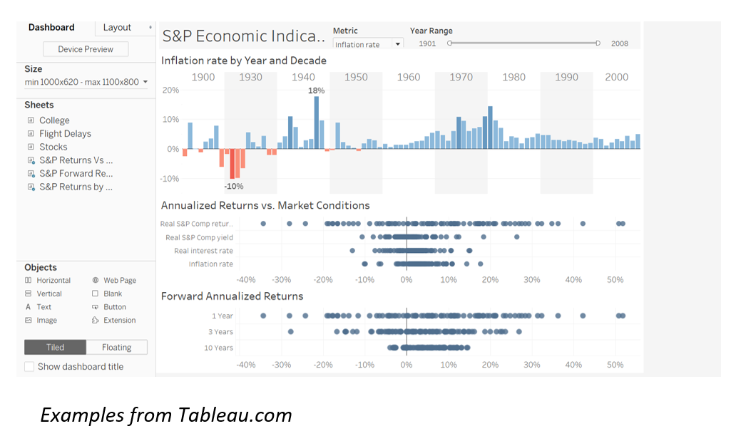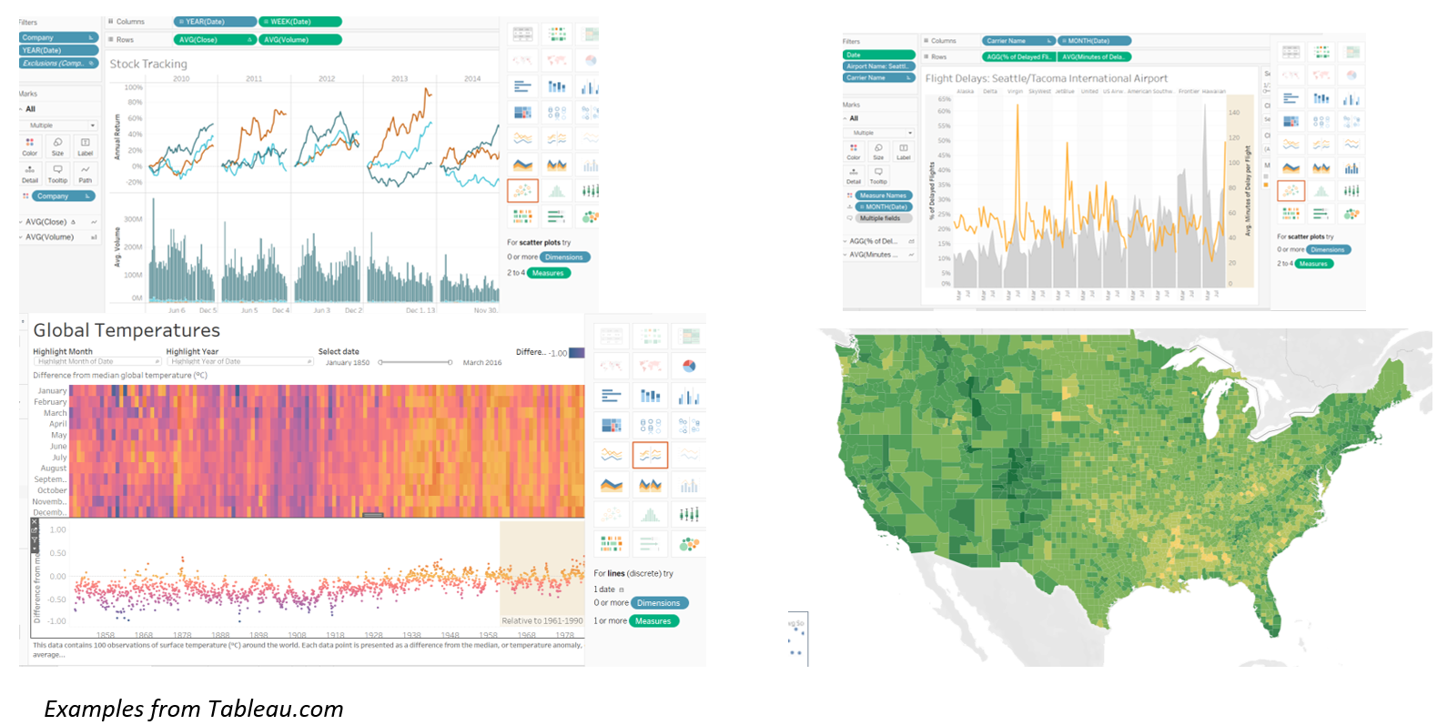 - Tableau Desktop provides a wide variety of visualizations that can be customized to fit any data output need. Users can switch visualizations or details “on-the-fly” if the visualization doesn’t suit the need for the moment. A few examples of visualizations: