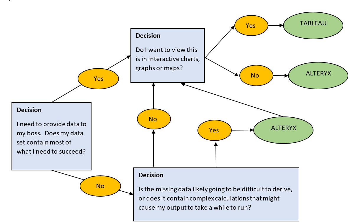 Overall, the findings suggest that when the importance of data analysis relies on the direct manipulation of a data source and less on the aesthetics of the output, Alteryx is generally more effective. If the goal is to provide easy–to–use and interpret output with beautiful visualizations, Tableau is the best choice. However, the power duo of using Alteryx to provide a clean and well-organized data set, then using Tableau for visualizing and slicing-and-dicing the Alteryx data set, gives a user an incredibly comprehensive, robust means of analyzing nearly any combination of complex data.
