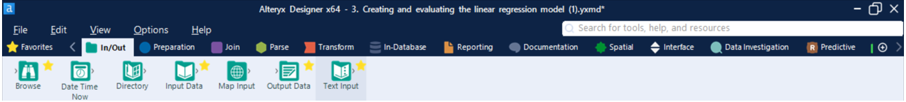 Much of the basic navigation is the same in Alteryx Designer regardless of the specific tool you are using. The color-coded menu at the top of the screen matches the tools that correspond to the menu. Additionally, there is a search bar, which allows users to search for a specific tool.