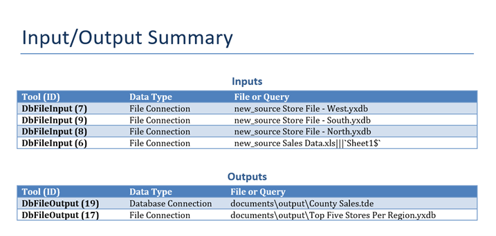 These reports also provide an overview of the workflow, displaying the Input/Output summary and tool breakdown by category. For example, using the screenshots below, we can tell that this workflow takes data from four files: three .yxdb files and one Excel File, and outputs a Tableau data extract and a .yxdb file that contains the combined data. We can also tell that this workflow is mainly concerned with cleaning and prepping the data from the input files, as it consists largely of preparation tools.