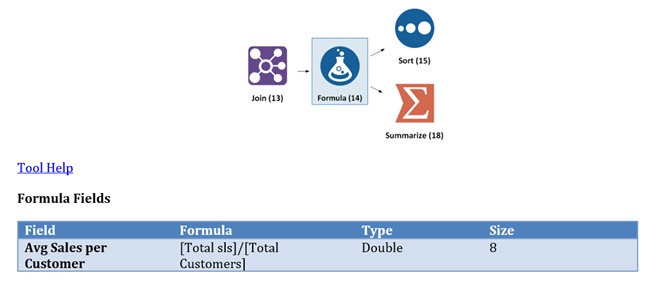 But what if a Gallery User needs to know more about how the workflow functions at a deeper level? For instance – What is that filter tool filtering, or what is being calculated with the formula tools? Simply review the Tool Configuration Details of the report. This section keeps track of what each tool does or how it is configured. For example: Which field was renamed with a Select tool? Which fields are coming from which input file, and which field is the header and which field is the value for a Cross Tab? In the example workflow, we can immediately tell that the formula tool is creating a field “Avg Sales per Customer” and setting the value to [Total sls]/[Total Customers].