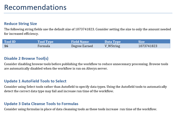 This report also contains a section that gives recommendations on how to improve your workflows. These suggestions help ready your workflows for a production environment. They tell you how to optimize your workflows and allow them to run more efficiently going forward. Below is a screenshot of a few recommendations given by WAM.