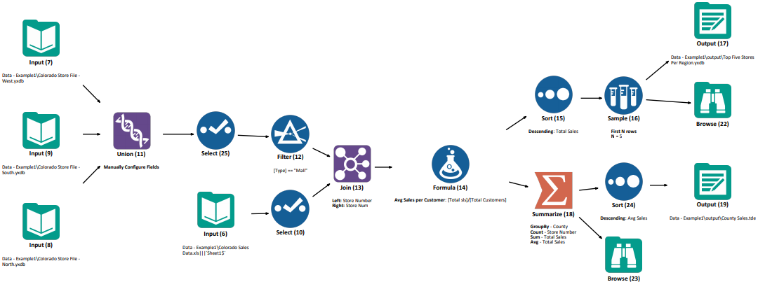 By comparing these two pages, we can get a high-level understanding of what this workflow is doing without ever opening Designer. To get a better idea of the workflow, we can look at the Flow Graph at the end of the report to see how the data flows from one tool to another, without even opening the workflow. Reviewing just three pages from the Audit Report, it is no surprise that the actual workflow looks like this: