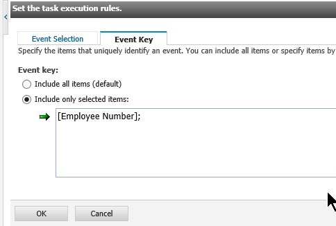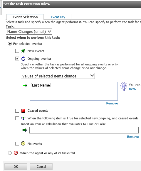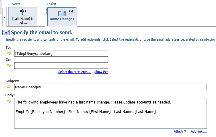 Since you want to be notified when a last name changes, you will check for on-going events. Every time Event Studio runs, it compares the current records for ‘last name is not null’ to the records generated from the previous run (the event list). If the employee number was in the previous list and the last name value changed, the email will be sent.