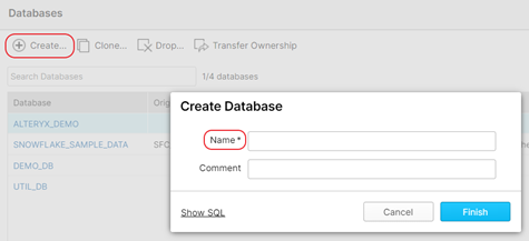 To start building an Alteryx workflow first create a new Snowflake database to write data into. To do this login to your Snowflake account and go to the “Databases” page. Click “Create” then assign the name of your database.