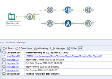 A lesser known way to improve runtimes is to use Formula tools instead of Data Cleanse tools. WAM will always recommend replacing a Data Cleanse tool in the workflow with a Formula tool. This is because the Data Cleanse tool is a macro that includes ten Multi-Field Formulas. For larger datasets, this can greatly increase runtimes, so it is recommended to use a single Formula or Multi-Field Formula tool to cleanse data so that Alteryx does not have to process the entire dataset more than necessary. For example, one could use a simple replace formula to remove all the whitespace in a field. In the workflow below, a large dataset of over one million records is being cleansed by both the Data Cleanse and Formula tools, but the Data Cleanse tool takes an entire minute to run, compared to the three seconds that the Formula tool takes. When cleansing multiple fields this way, a Multi-Field Formula tool can be used with a runtime closer to the Formula tool rather than the Data Cleansing tool.