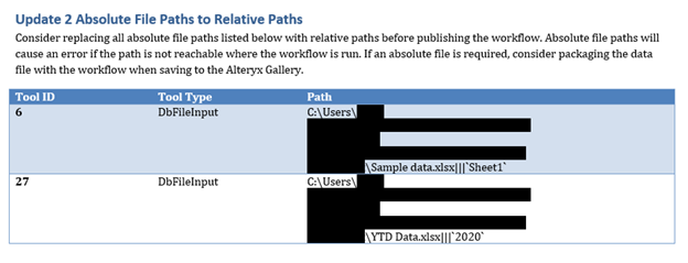 Another way that WAM can help improve workflows is by suggesting changes that help with the workflow’s flexibility. To do this, WAM will always make a suggestion when a workflow includes an absolute path or an Auto Field tool. If absolute paths are used, the workflow will be unlikely to work for a different user without remapping the input and output files. This is because the file path will be different for different users, even for shared locations such as SharePoint. Instead, relative paths should be used to ensure that the input/output files are accessed relative to the workflow’s location. A useful article on relative file paths can be found here: https://community.alteryx.com/t5/Alteryx-Designer-Knowledge-Base/How-To-Use-Relative-Paths/ta-p/1160