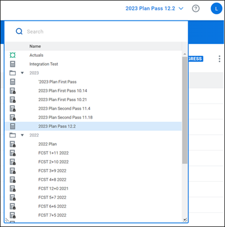 Example of a version dropdown in Workday Adaptive Planning. Versions can be grouped into folders so that you can retain PY versions while still having a clean selection list. The padlock symbol indicates a locked version: