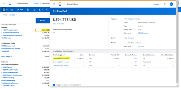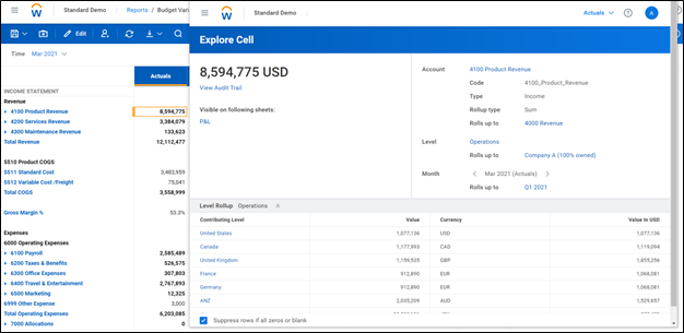 - Workday Adaptive Planning reports are drillable (depending on user access), so any detailed data underneath the amount is available within the same report view, even when not specifically called out on the report.