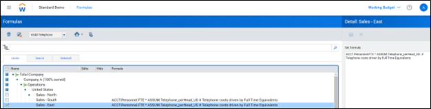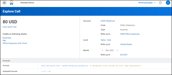 The Explore Cell view below indicates that the formula is multiplying a telephone amount per FTE assumption by the FTE amount for the specified version/level (Working Budget/Sales – East).